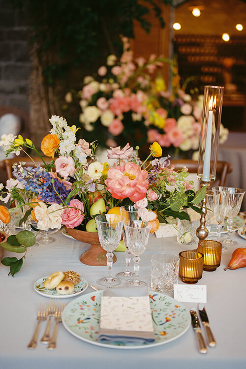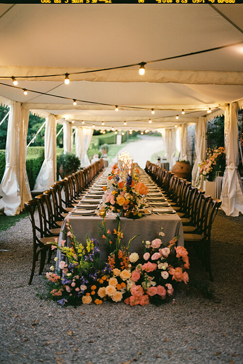The bride carried a bouquet of coral peonies, ranunculus, and delicate garden blooms, while long tables glowed with flickering candlelight, pastel place settings, and arrangements brimming with cheerful pops of pink, orange, and yellow.