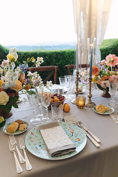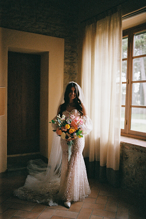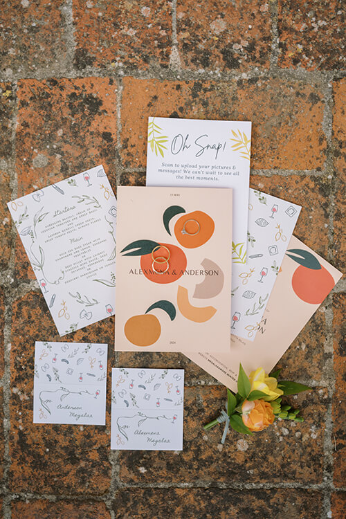 Alexmena and Anderson’s wedding in the rustic, charming Hamlet radiated joy and vibrancy, a celebration filled with color and personality. Their day was infused with a playful yet refined spirit, where citrus motifs, whimsical stationery, and bursts of florals transformed this country chic wedding in Chianti into a lively celebration.