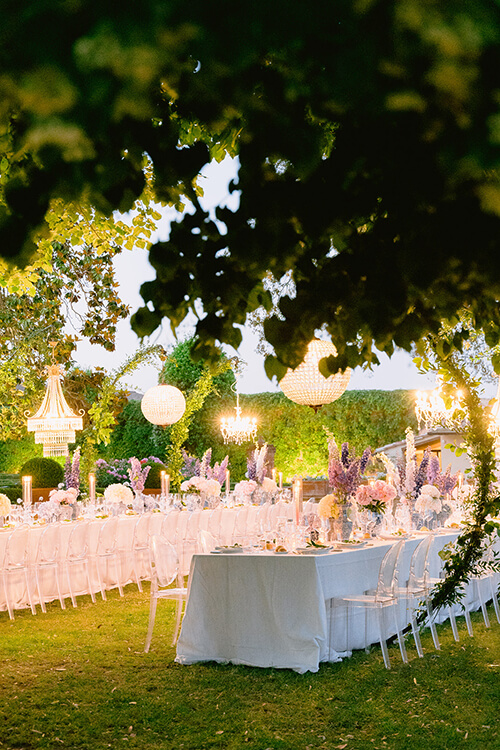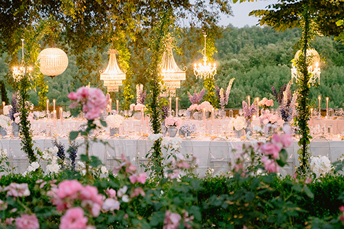 In the heart of Tuscany, just a short drive from Siena and its enchanting wedding venues, beneath the open sky framed by the 13th-century Gothic arches of San Galgano Abbey, Marie and Ryan’s wedding unfolded as a masterclass in understated luxury. A vintage Bentley, crystal chandeliers, and Marie’s gilded laurel crown were nothing short of grandeur, yet the ethereal setting of the roofless abbey, softened by pastel florals like delphiniums, peonies, and hydrangeas, and feminine details, brought together a celebration that was both majestic and intimately romantic. The ancient stone walls, steeped in centuries of history, provided a peaceful backdrop for the ceremony and balanced the day’s elegance with timeless grace. It was truly a fairytale to behold.
