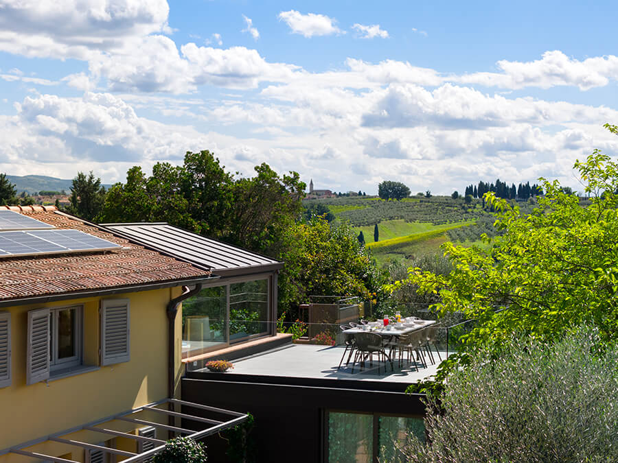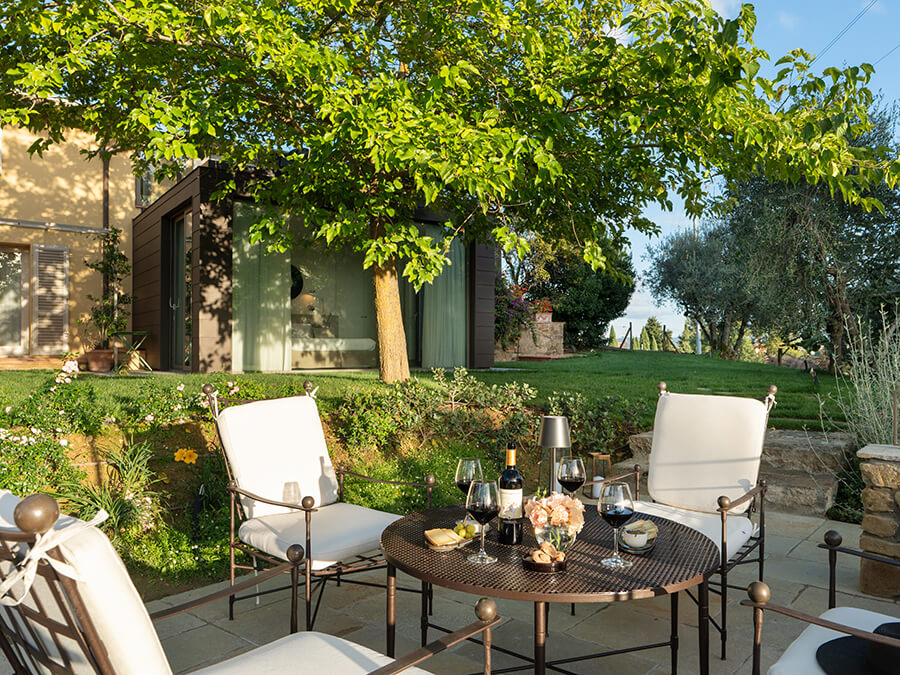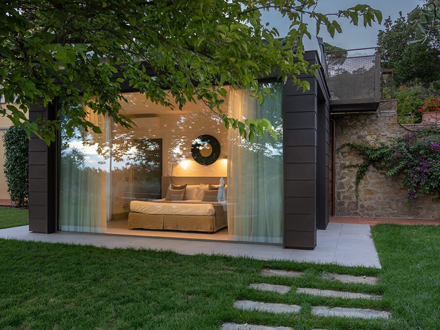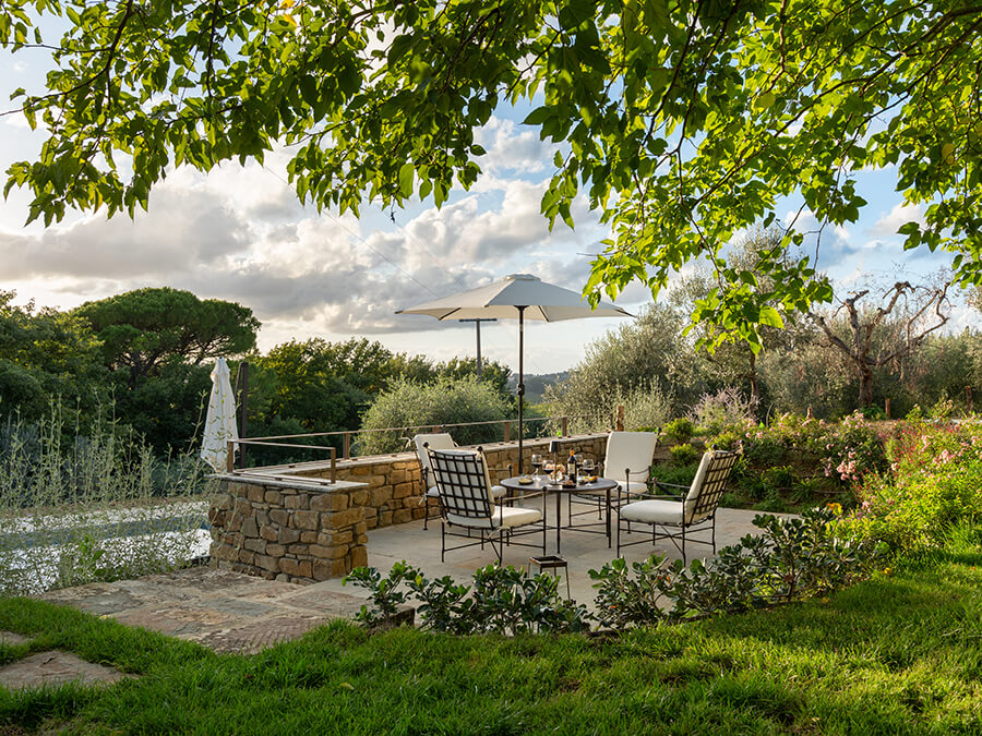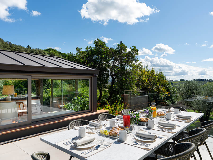 The villa is designed for comfort. It features four stylish bedrooms, each with a private bathroom and air conditioning. Soft neutral tones blend with curated furnishings to create a calm and luxurious atmosphere. The main living area is wrapped in glass, so guests can enjoy views of the terraces, gardens, and Chianti’s gradient sunsets. In addition, the space makes it easy to relax with a book, share meals, or spend time with family and friends.
