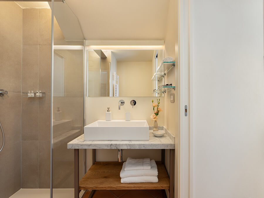 Casa Liliana’s outdoor spaces are designed for peaceful living in nature. The private 11 × 5 m swimming pool overlooks olive groves and rolling hills, surrounded by sun loungers and shaded umbrellas. Multiple terraces offer spaces for dining, lounging, or enjoying sunset aperitifs. The garden, filled with flowers, herbs, olive trees, and manicured lawns, wraps around the villa and creates a sense of privacy and tranquility. A cozy veranda allows guests to enjoy nature even in cooler months.