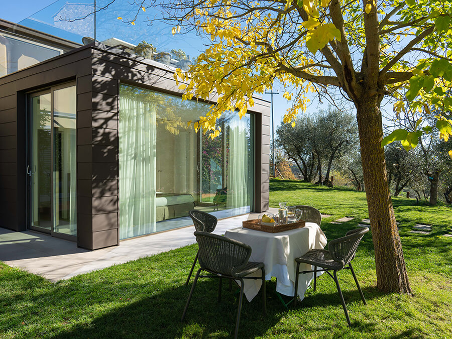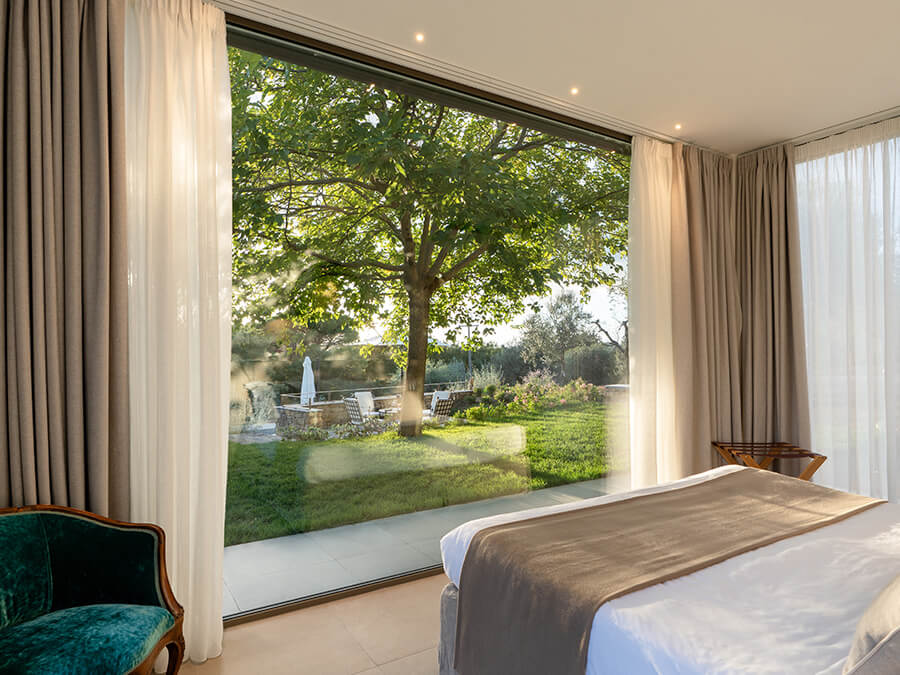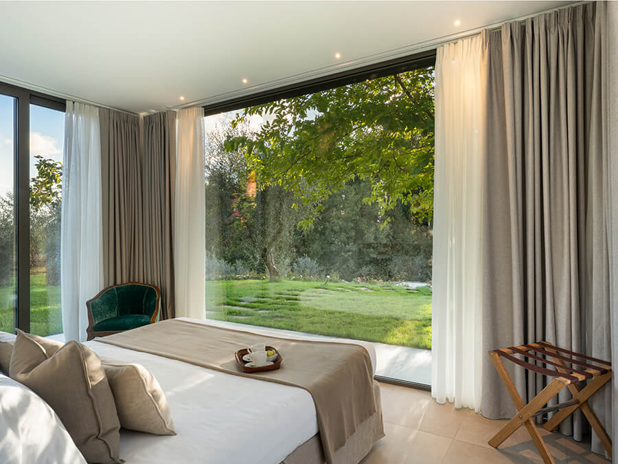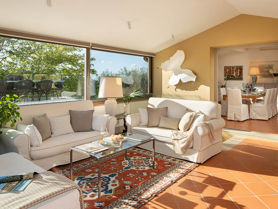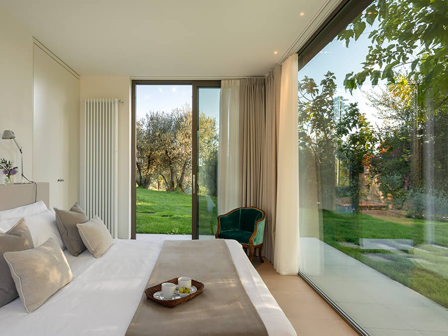 Casa Liliana sits in a peaceful hamlet surrounded by vineyards, olive groves, and woodlands. The setting offers quiet, privacy, and a deep connection with nature. With floor-to-ceiling glass walls framing the garden and rolling hills, the villa feels bright and open. It creates an immersive experience of countryside living.