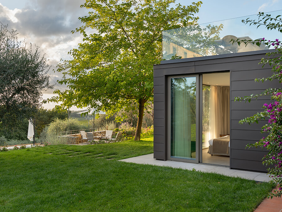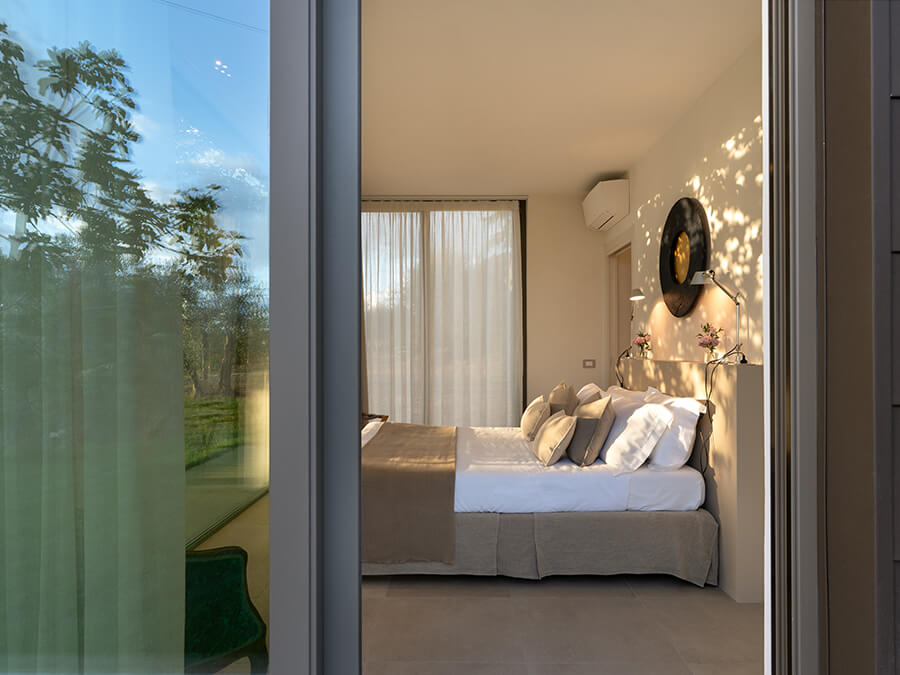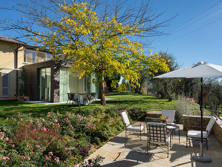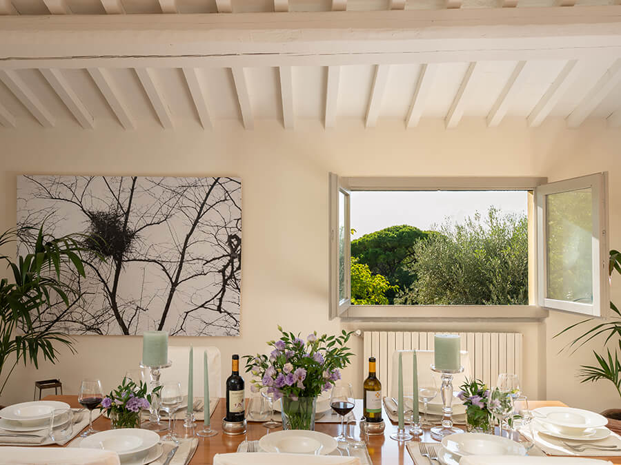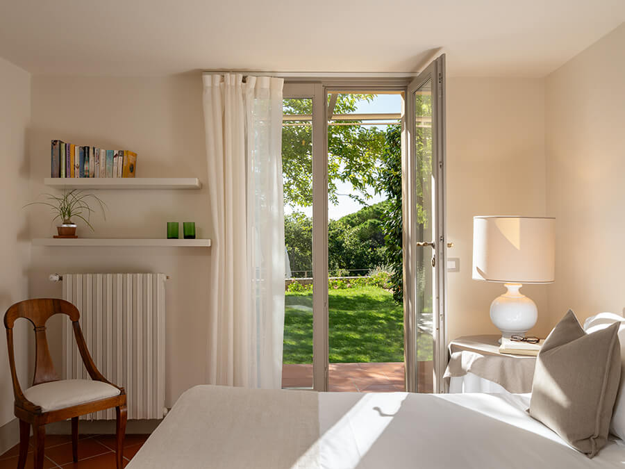 Casa Liliana sits in a peaceful hamlet surrounded by vineyards, olive groves, and woodlands. The setting offers quiet, privacy, and a deep connection with nature. With floor-to-ceiling glass walls framing the garden and rolling hills, the villa feels bright and open. It creates an immersive experience of countryside living.