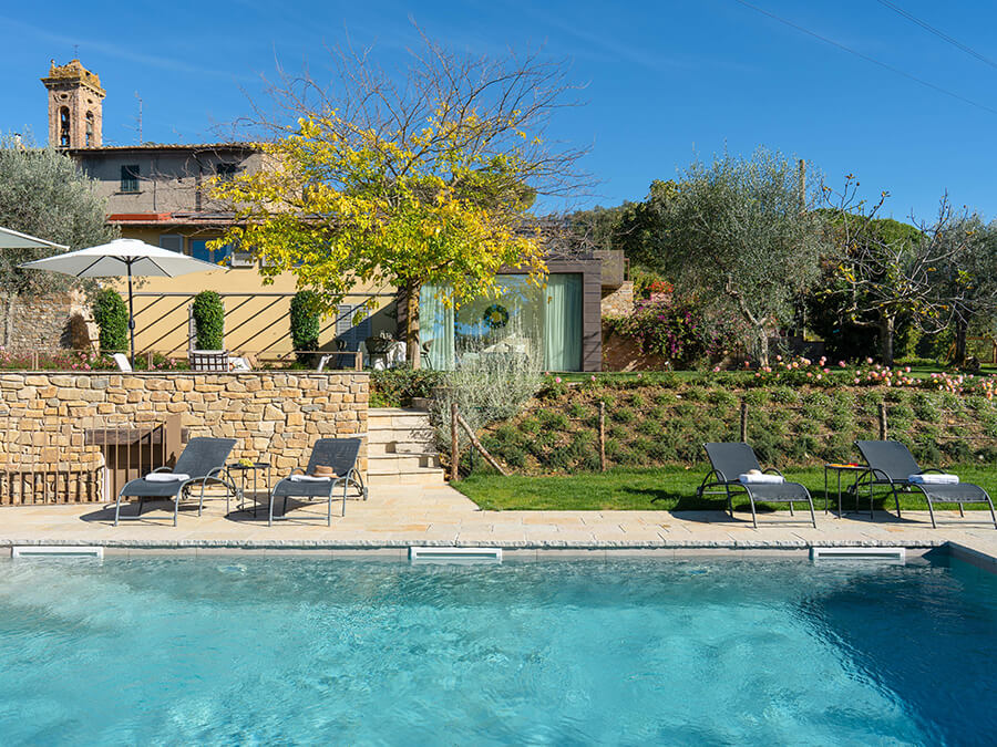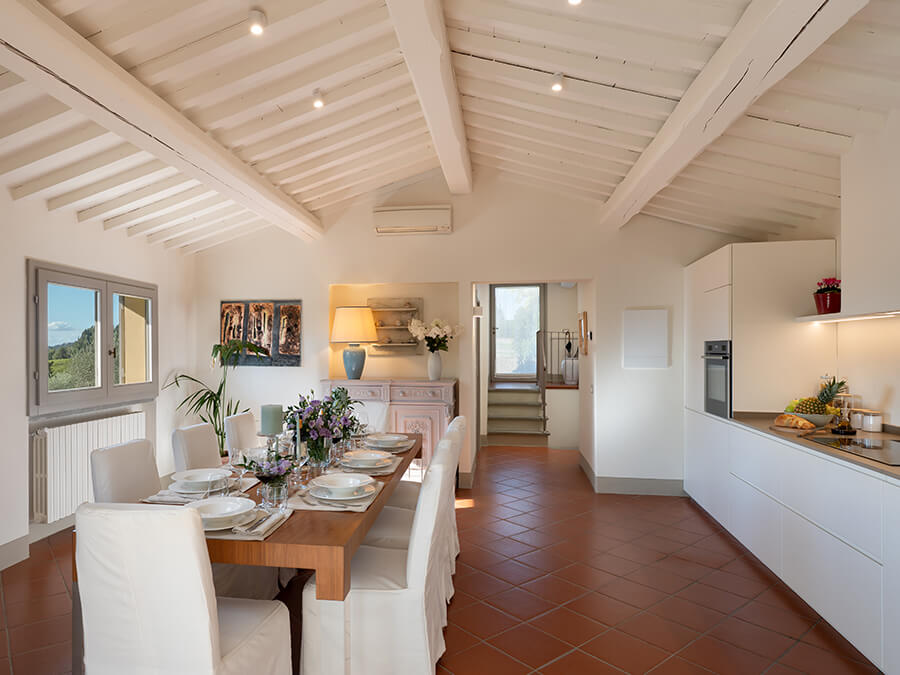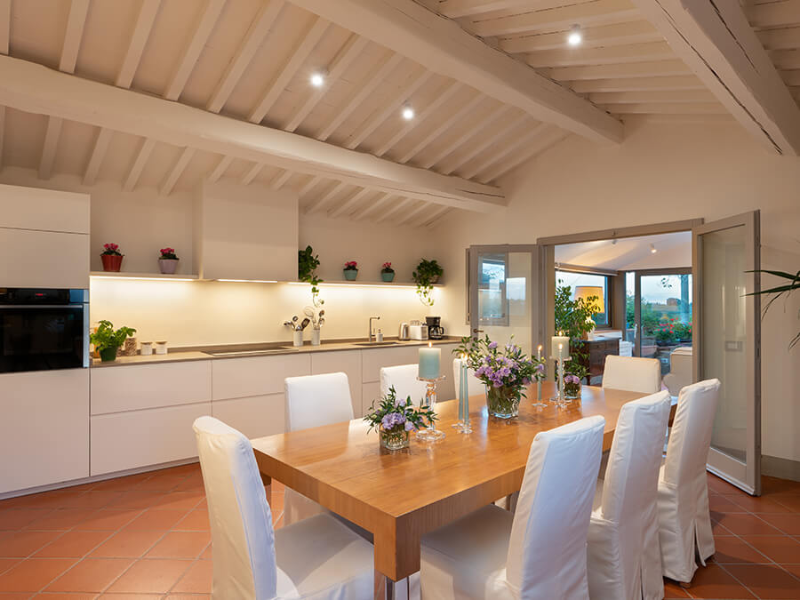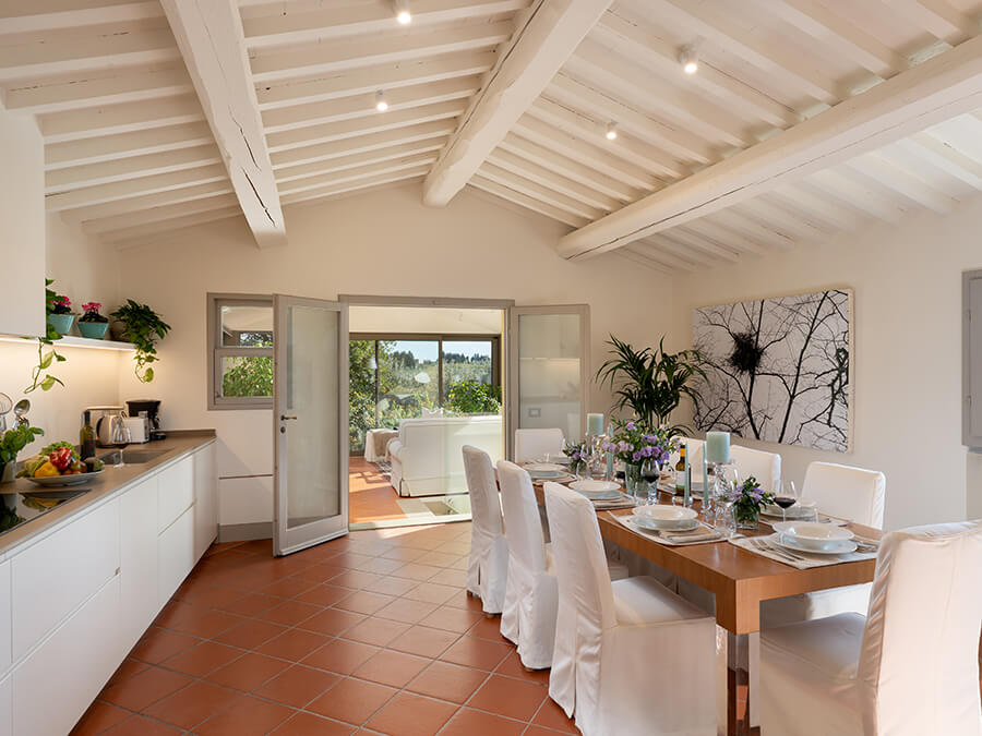 Casa Liliana combines modern amenities with authentic Tuscan character. The fully equipped kitchen opens directly to outdoor dining areas, which makes alfresco meals simple and inviting. Guests can unwind on the panoramic terrace, sip morning coffee under the olive trees, or cool off in the private pool. Moreover, the gardens and terraces shift beautifully with each season, offering peaceful corners throughout the day.