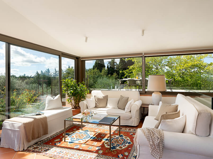 • Panoramic glass-walled living room with sofas and garden views