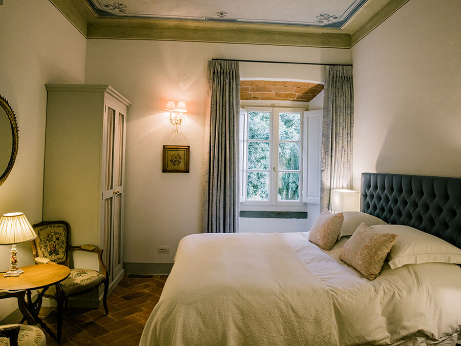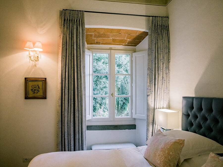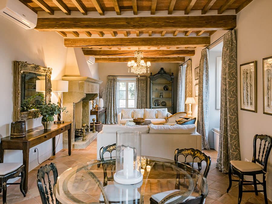 Inside, the villa exudes timeless charm. The main house includes spacious living areas with open fireplaces, a TV lounge, and a fully equipped modern kitchen that flows to the outdoor dining terrace. Furthermore, the elegant bedrooms are air-conditioned and designed with sweeping views of the valley, the gardens, or Cortona’s rooftops. The décor balances old-world details like beamed ceilings and stone walls with stylish furnishings and thoughtful amenities. In addition, a converted chapel with its own bedroom and terrace, plus an annex with additional suites, ensures comfort and privacy for every guest.