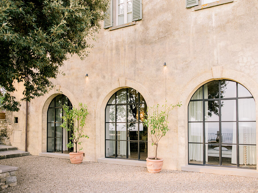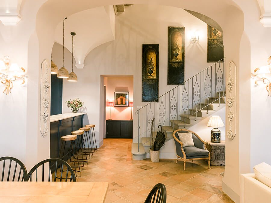 The gardens are just as captivating as the interiors. Ancient olive groves, terraced landscaping, and the ruins of a medieval monastery create a setting unlike any other. Moreover, guests can swim in the private pool, gather for an al fresco meal on one of the dining terraces, or enjoy bocce on warm afternoons. Quiet corners for reading, as well as lounge areas with panoramic views, provide peaceful retreats throughout the grounds.