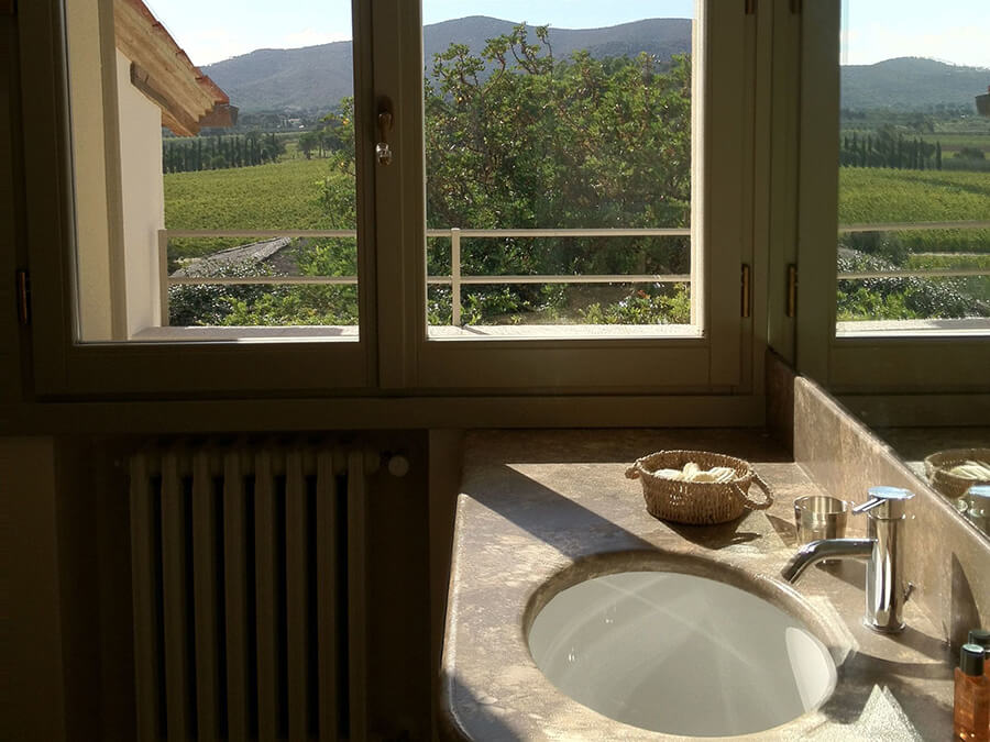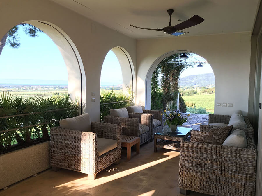 Villa Prile has a spectacular hilltop position among vineyards. From the property, breathtaking views stretch across the countryside and toward the sea. On clear days, the island of Giglio appears on the horizon, rising from the Tyrrhenian waters.