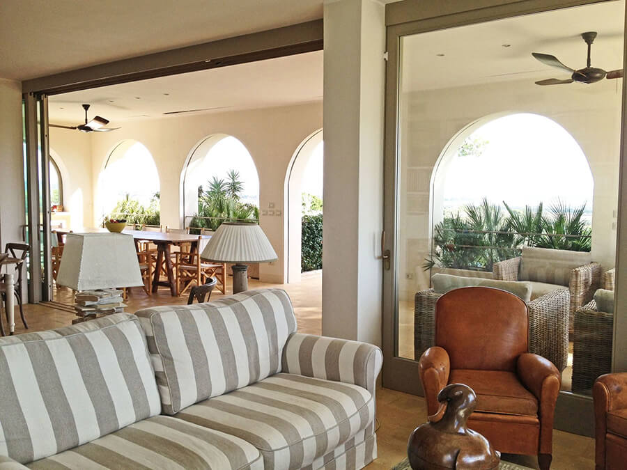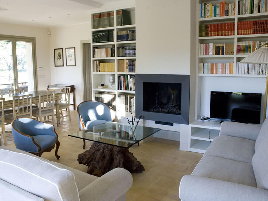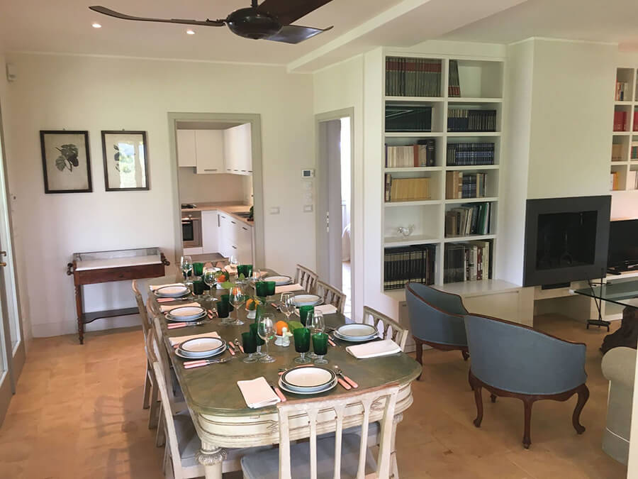 Inside, the interiors feel bright and welcoming. Large sliding glass doors open directly to the garden and terraces, creating a seamless connection between indoor and outdoor spaces. This design reflects the relaxed rhythm of coastal Tuscan living.