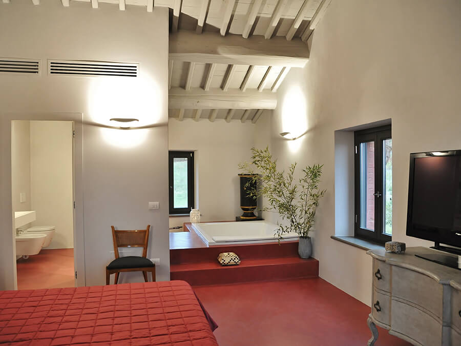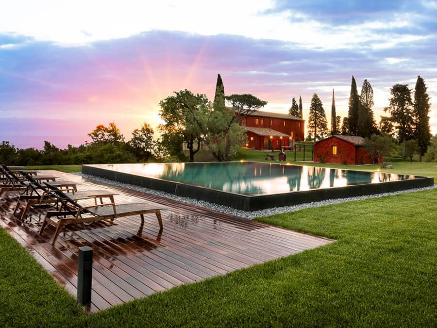 The estate spans over 4 hectares of private grounds; two of those hectares are fenced. Additionally, it features herb and vegetable gardens, fruit trees, and hidden seating areas, perfect for reading or stargazing. In the garden lies the 7×13 meter infinity pool. It is flanked by loungers and a shaded patio, offering unobstructed views of the rolling Tuscan hills. Furthermore, the villa’s elevated position (600m above sea level) brings fresh breezes and cooler evenings, even in summer.