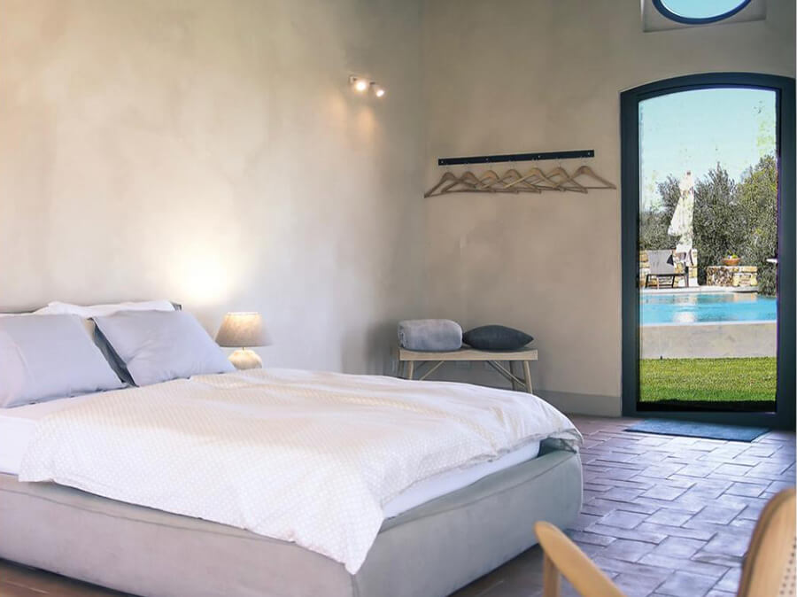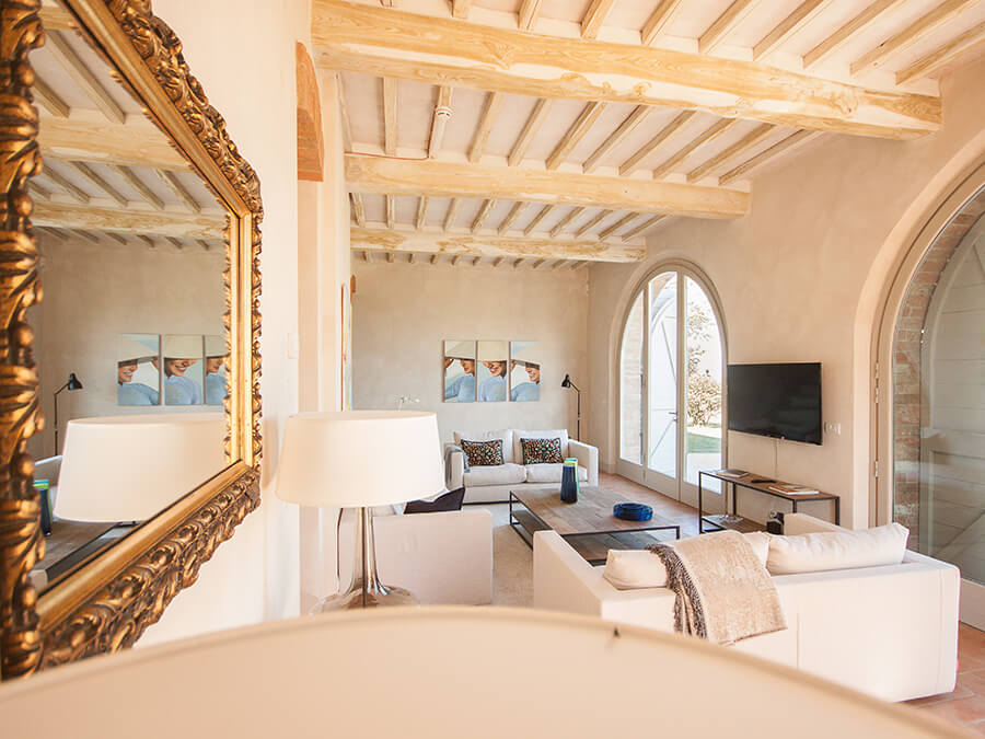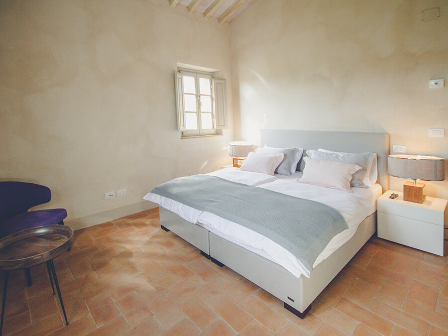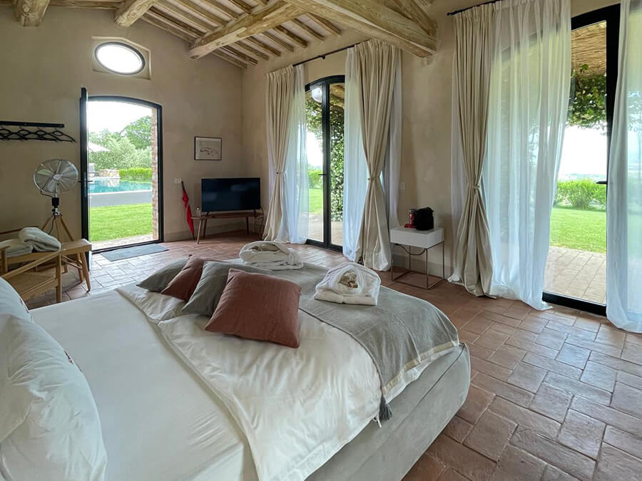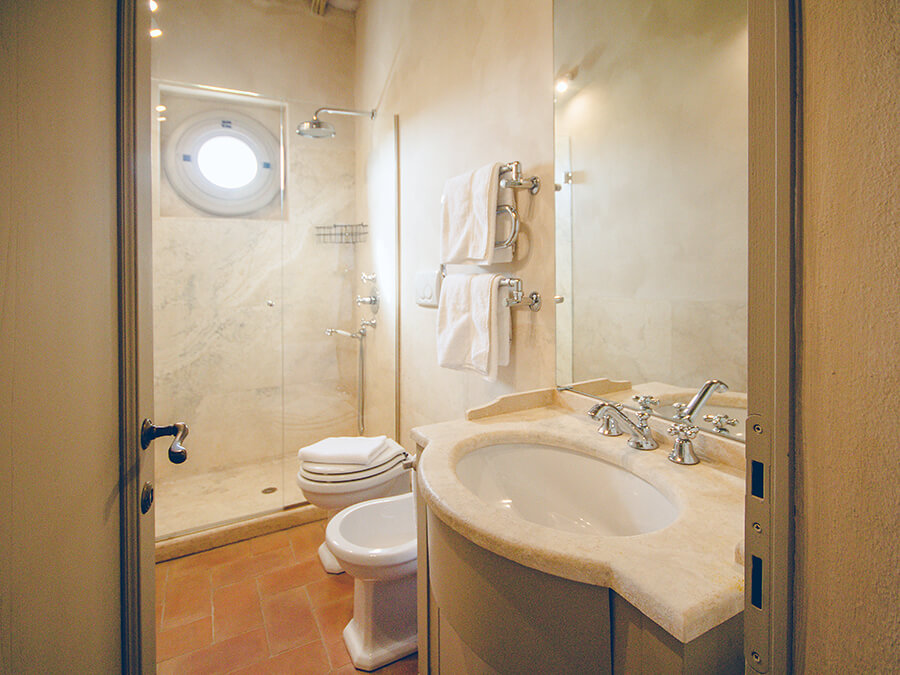 Villa Icario accommodates guests across three beautiful suites and two private cottages. Each bedroom includes a king-size bed and en-suite bathroom finished in Tuscan marble and natural stone. The Nobile Suite offers additional lounge space, while the cottages provide independent access and extra privacy.